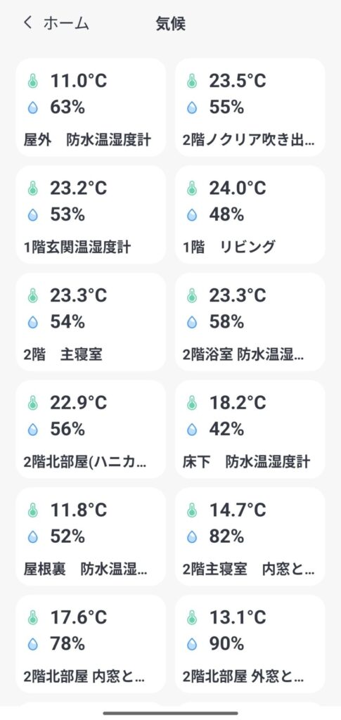↓ある10月の屋外と屋内の各部屋の温湿度です。