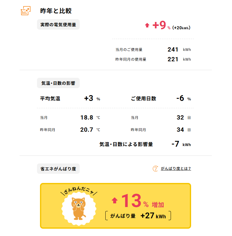 昨年同月に比べ約9%電気使用量が増え、電気代は約1,000円ほど高くなりました。