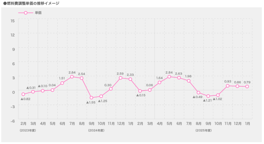 2025年12月使用分は0.79円/kWhと少し値下がりです。