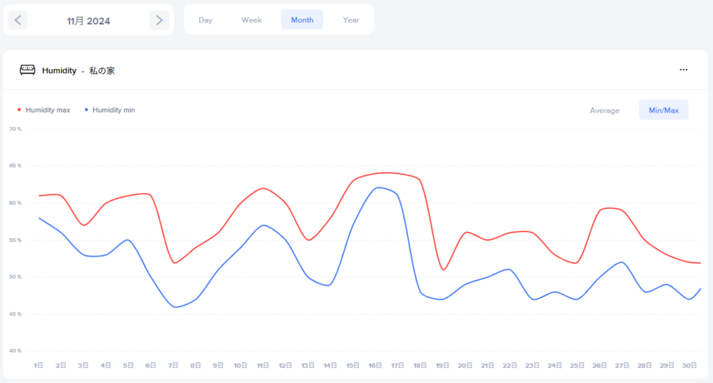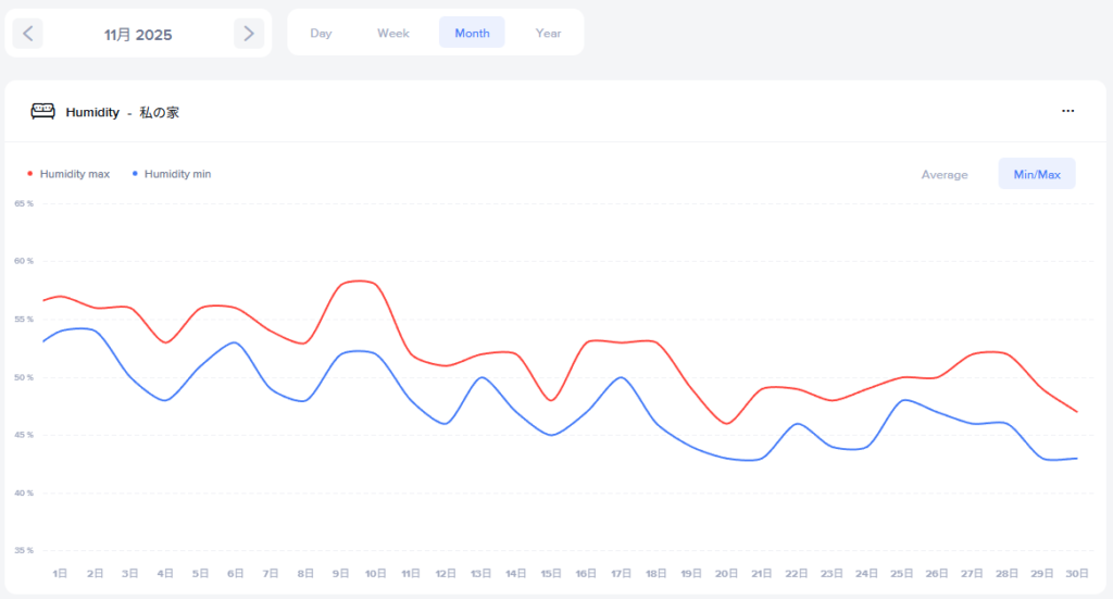 2025年11月と2024年11月の室内の湿度推移は↓
