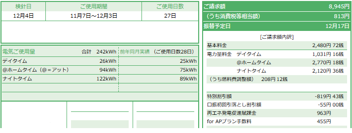 電気代:8,945円(242kWh)