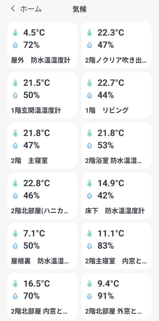 ↓ある11月の屋外と屋内の各部屋の温湿度です。