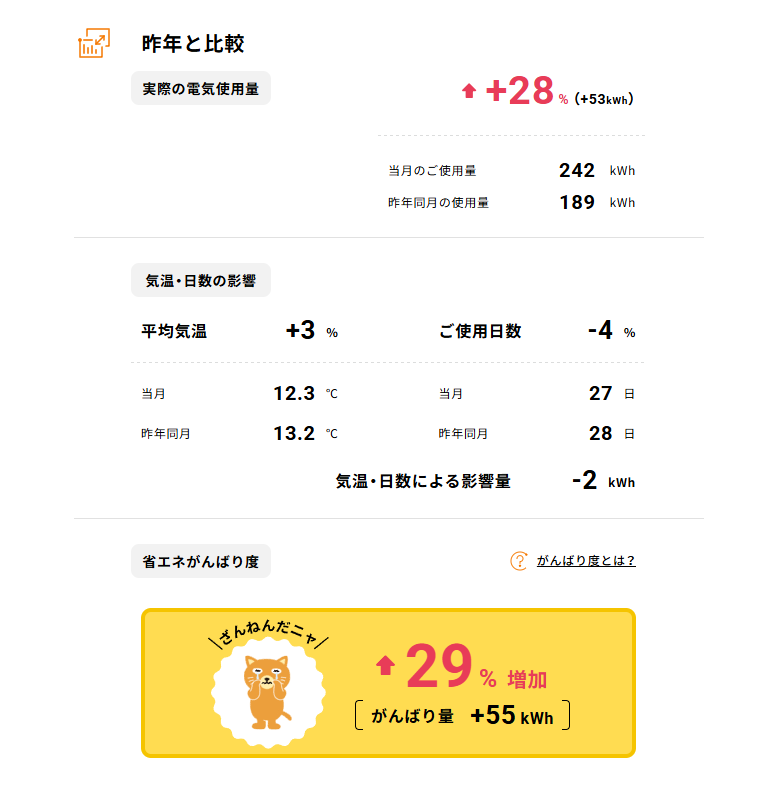 昨年同月に比べ約28%使用量が増え、電気代が約200円ほど高くなっています。