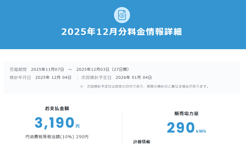 今回は2025年11月実績の電気代と太陽光発電売電です。