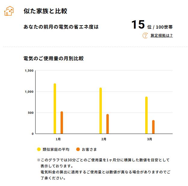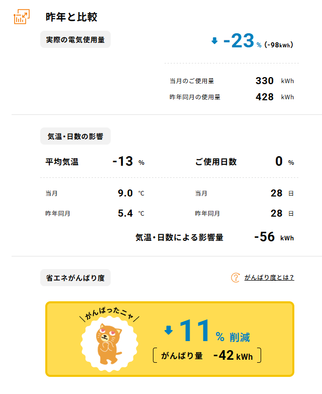 昨年同月に比べ約23%使用量が減り、電気代が約5,000円ほど安くなっています。
