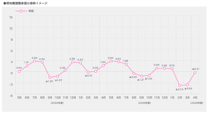 2026年3月使用分は政府支援1.5円/kWhに下がることもあり▲0.31円/kWhと大きく上がります。