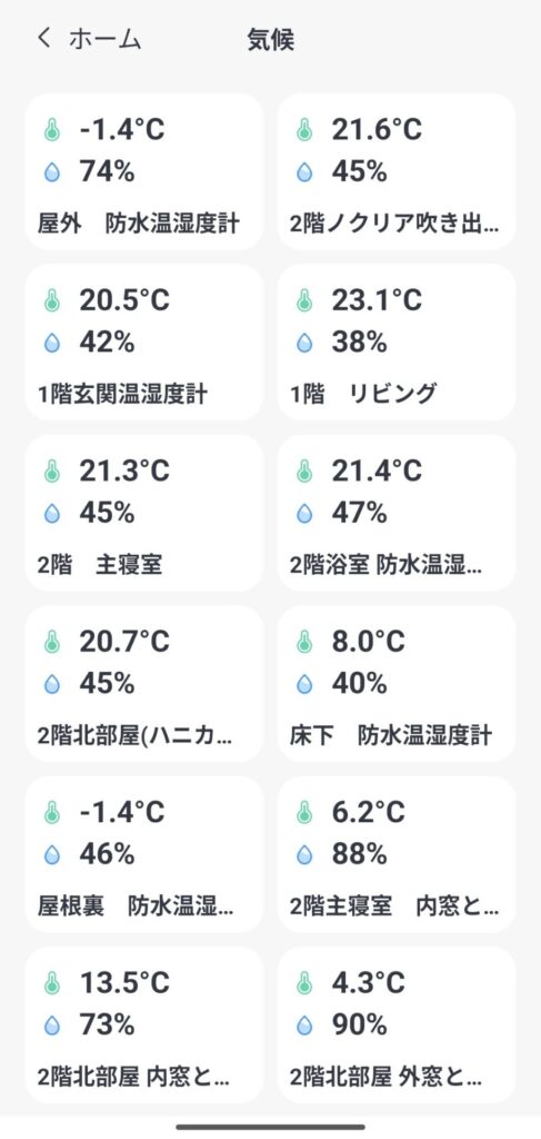 ↓ある2月の屋外と屋内の各部屋の温湿度です。