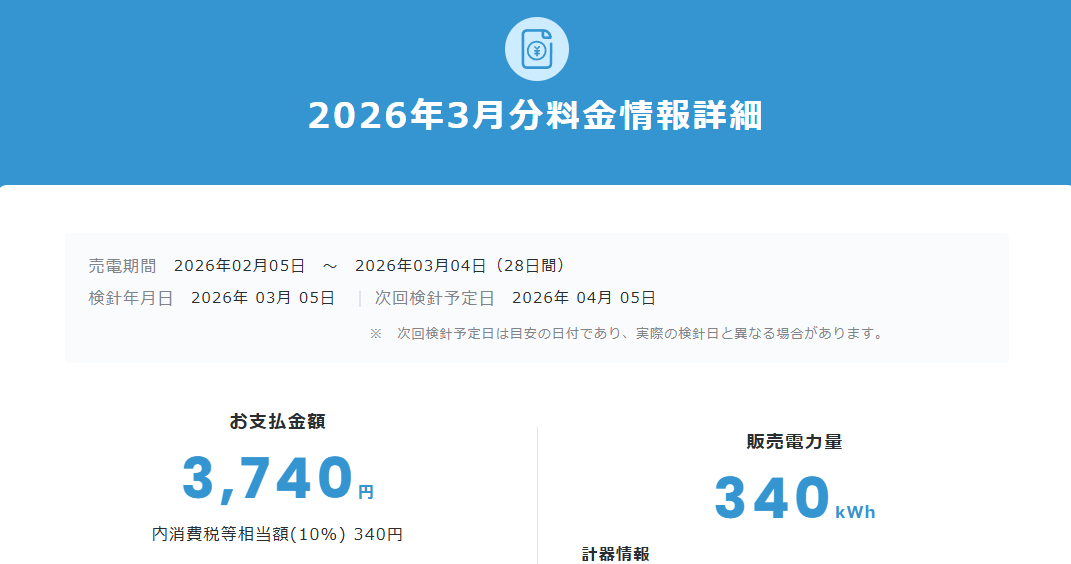 今回は2026年2月実績の電気代と太陽光発電売電です。